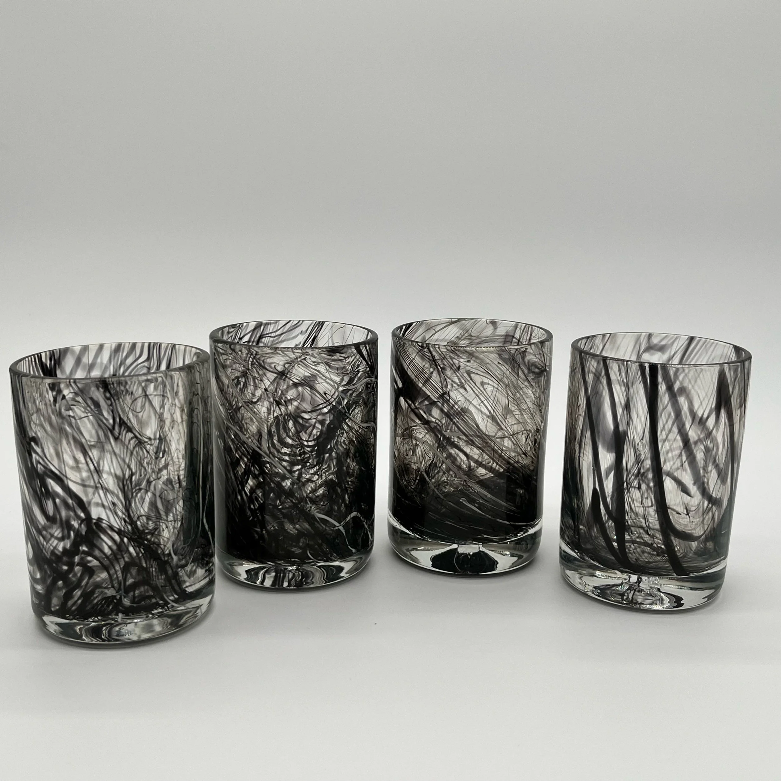 Shop › Black Chaos Cane glasses Image 1 of 1 Black Chaos Cane glasses $75.00 4”x2.75”. Holds about 12 oz. Add To Cart Added! 4”x2.75”. Holds about 12 oz.